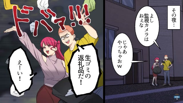 監視カメラがないことを確認して、隣人の家の前に生ゴミをまいた主人公一家。