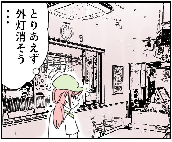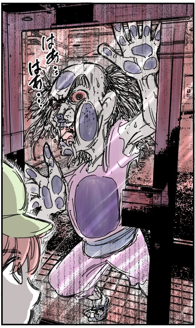 そして主人公が、外灯を消そうとするとガラス戸の向こうに客が張り付いていました…。