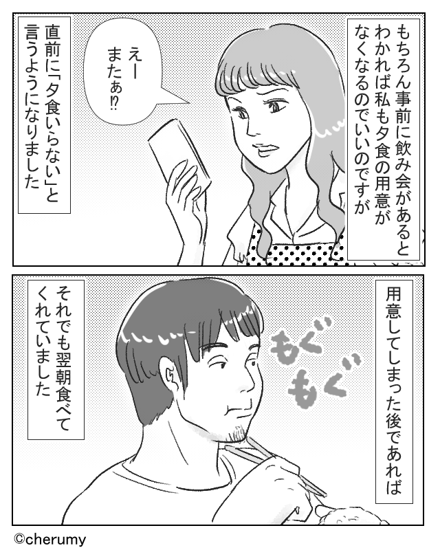直前に夕食がいらないことを連絡してくるのに、主人公に怒る夫。
