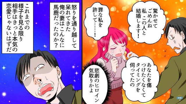 主人公が悲劇のヒロイン気取りの妻に呆れていたそのとき、浮気相手は妻を捨ててその場から逃げ出して…。