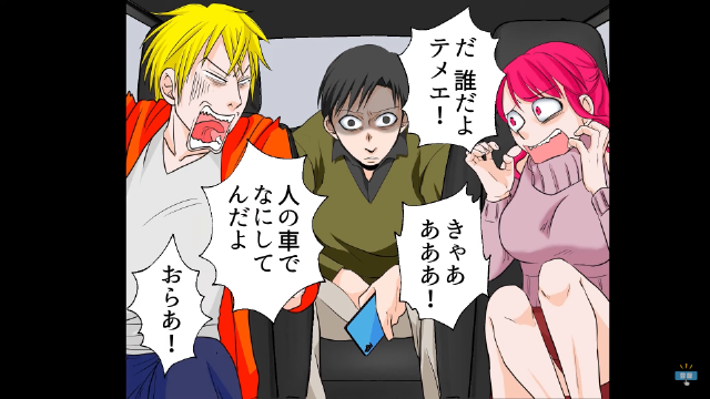 車の後ろに乗り込んだ主人公の存在に気がつき、妻と浮気相手は絶叫。