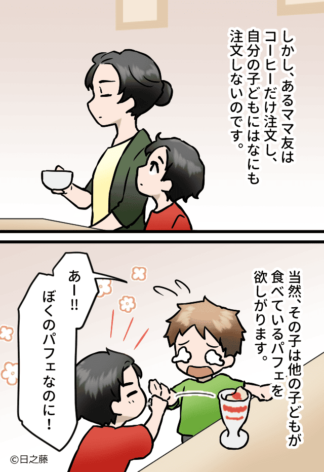 そのママ友の子どもは当然パフェを欲しがり、他の子どもたちのパフェを横取りする始末…。