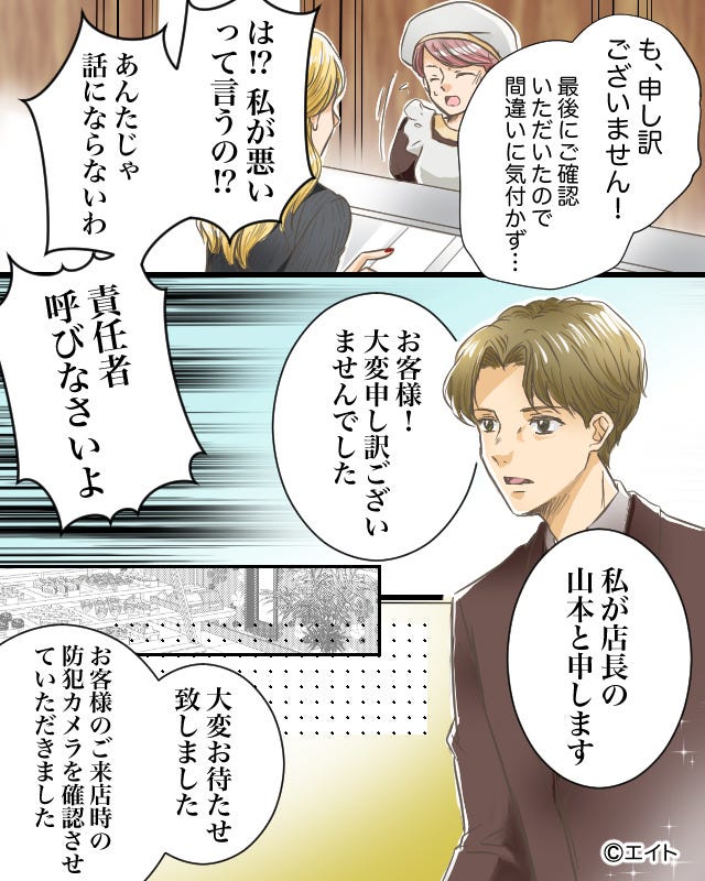 こんな店長のような上司の元で働きたいなと思いました。 クレーマー相手にきちんと対応してくれる店長がいると、店員としても心強いですよね。 (30代/女性)理不尽なクレームをつけられると、嫌な気分になりますよね…。 店長が的確な対応で主人公のミスではないことを証明してくれて、安心しました。 (40代/女性)イラスト:エイト
