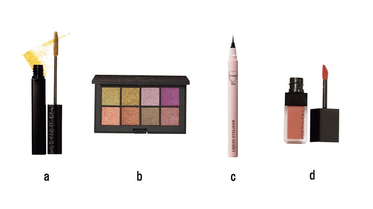 aを上まつ毛に塗る。まつ毛の上側からも下側からも塗って、しっかり色づけ。dでリップを仕上げたら完成。