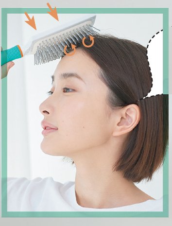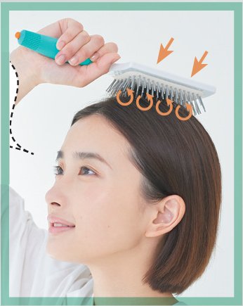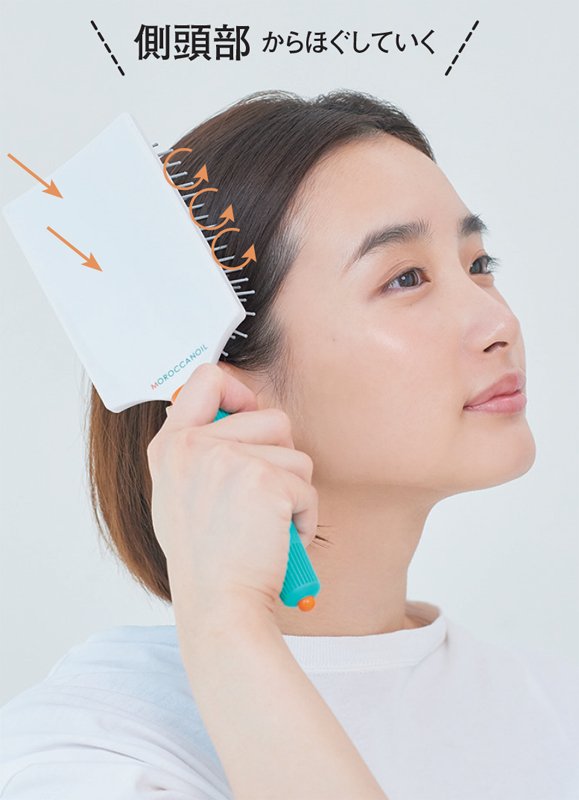 「時間がない朝に効率良く頭皮をほぐすなら、ツールを活用して。広い面積を一気にケアできる〝大きめのパドルブラシ〟を使うのがおすすめです。パドルブラシは、クッション性が高く、頭皮にピタッとフィットするものを選んで。パドルブラシを頭皮に押し当ててツボ押し+頭皮全体をブラッシングするたった2STEPでパッと明るい顔に!」(伊熊さん)