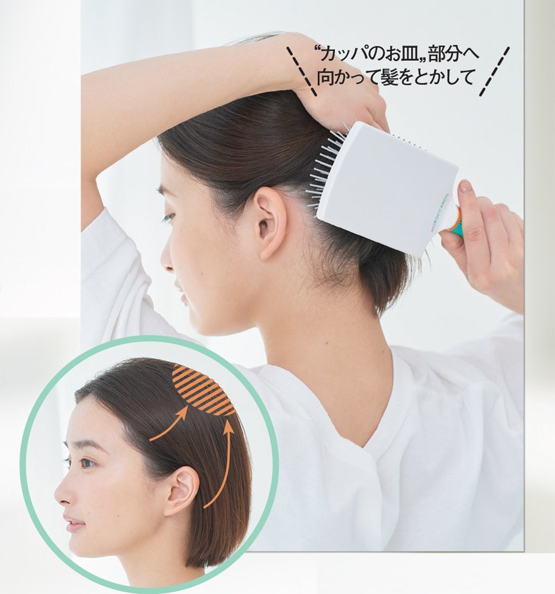 いわゆる〝カッパのお皿〟部分に当たる帽状腱膜へ向かって、頭皮全体をパドルブラシでブラッシングしていく。後頭部は襟足から髪をかきあげるようにとかして。髪が長い人は、毛先までとかし切らなくてOK。頭皮を刺激するのを意識して。