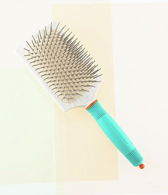 ブラシ毛がセラミック製のパドルブラシ。ブラシ部分の幅が広く、毛足も柔軟でクッション性も◎。さまざまな髪質の人に対応できる設計。モロッカンオイル パドルブラシ ¥3,080