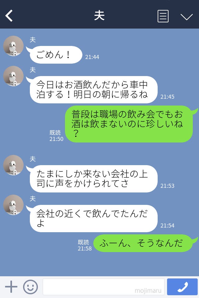 お酒を飲んで車中泊をしたと話す夫が、妻に嘘をついていたようです。