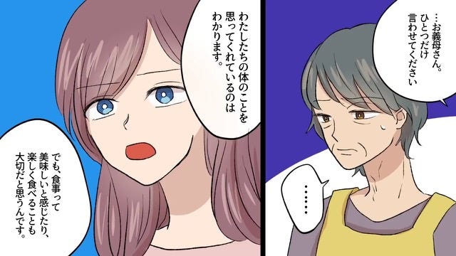 夫の説得で反省した様子の義母はその後、主人公たちの食生活に口出ししないことを約束してくれます。