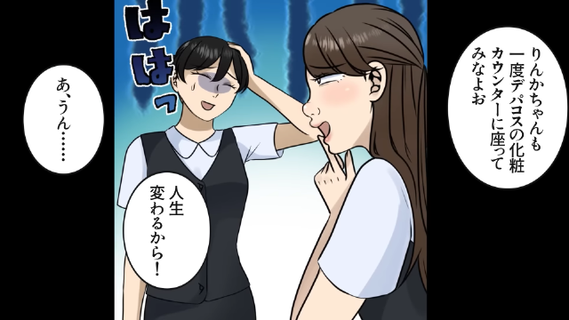 化粧品カウンターでフルメイクをしてもらい、主人公は大喜び。