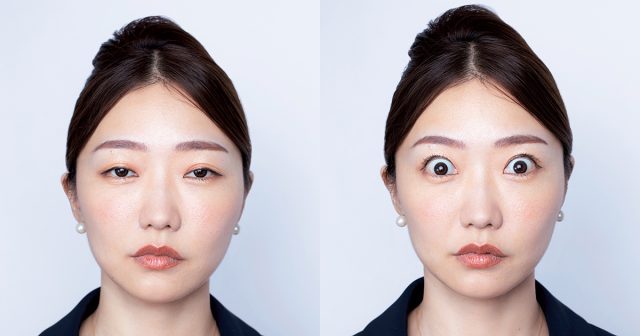 ひが 驚きのポーズで目を開く筋肉を鍛えましょう。