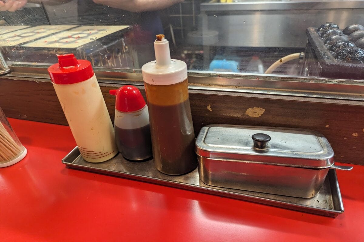 ソースは自分でかける方式で、マヨネーズに醤油、ソースにかつお節、青のりとスタンダードなもの。