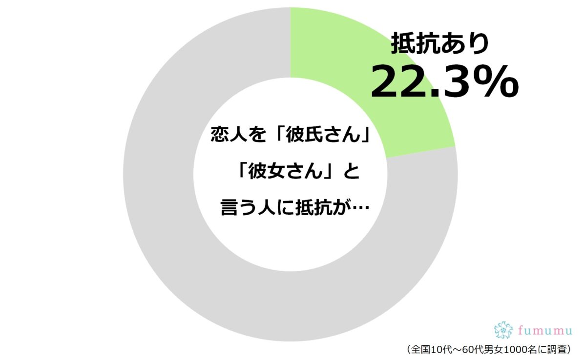 まずは、fumumu編集部が「恋人を『彼氏さん』『彼女さん』と呼ぶ人に抵抗があるか」について、アンケート調査を実施。その結果、男女1,000票の回答を得ることでき、22.3%が「抵抗あり」と答えました。