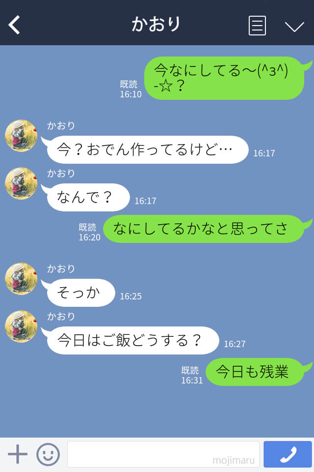 妻に、今日も残業だとそっけないLINEを送る主人公。