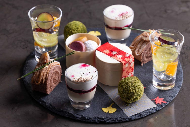 (左奥から)「秋果実と日本酒のジュレ」「京番茶ショコラモンブラン」「和栗とコーヒーのヴェリーヌ」「錦秋ふきよせ」「積翠園借景苔玉」など 「フォーシーズンズホテル京都」では、11月30日(木)まで「京の秋 アフタヌーンティー」を開催中。
