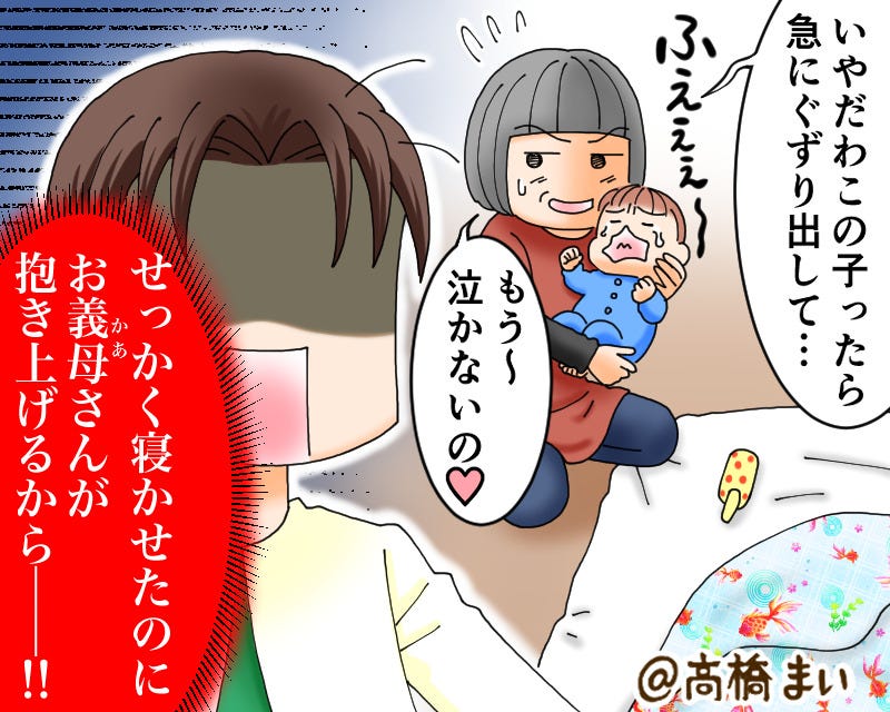 せっかく寝かしつけをしたのに、息子を抱っこする義母。