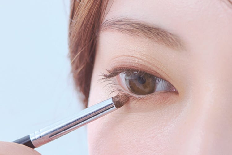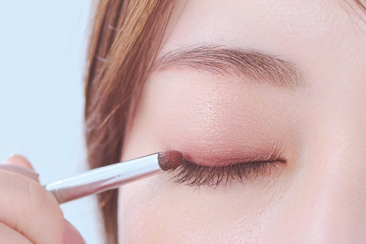 アイパレ右上の濃茶を細筆で、上まぶたのきわに入れる。アイラインがわりに引き締められるし、今っぽい赤みを感じさせる目元に。