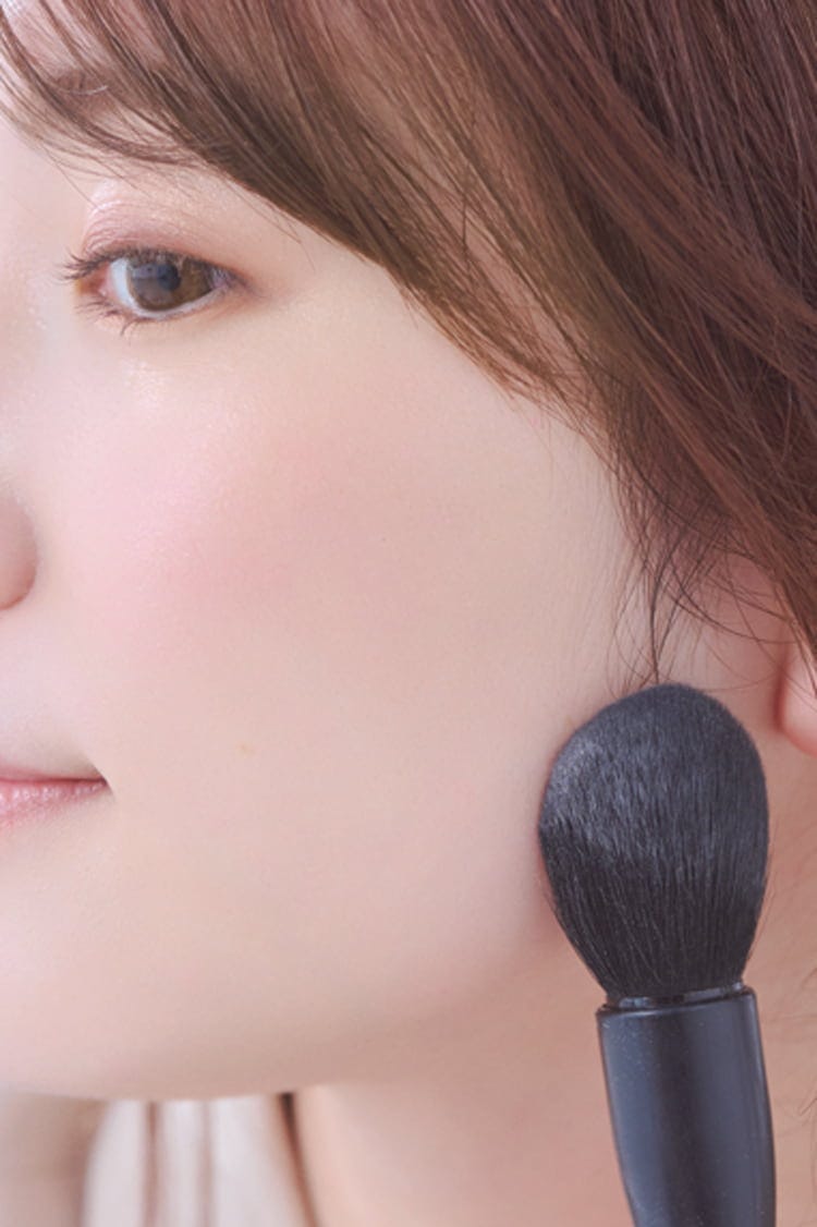 フェイスラインはマットにして小顔効果シェーディングの上にメイク キープ パウダーを重ねる。影色をのせるだけじゃなく、質感をマットにすると奥行きが出やすいんです。