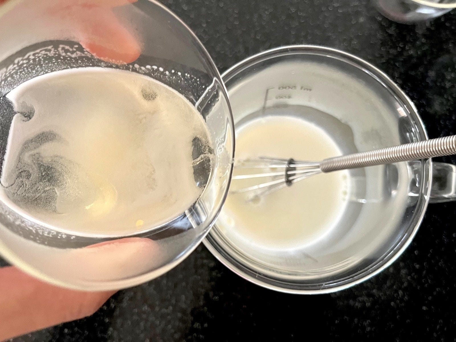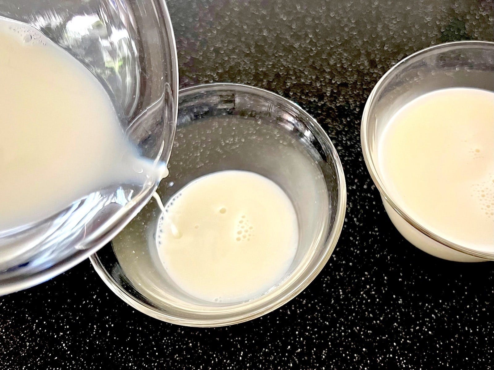 残り半量の牛乳を加え、よく混ぜます。これでプリン液の温度が下がるので、固まるのが早くなります。プリンカップに注ぎ入れ、冷蔵庫で固まるまで冷やします。