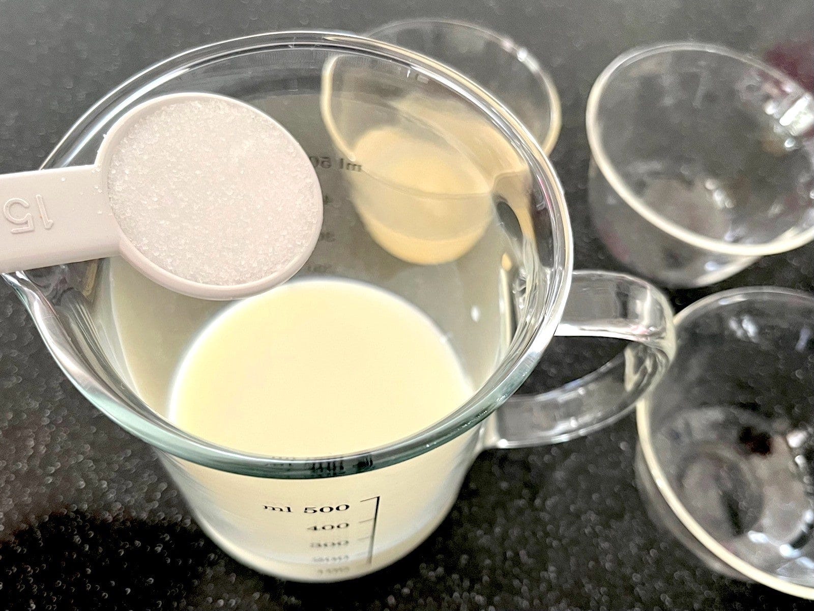 半量の牛乳にグラニュー糖を入れ、1000wの電子レンジで1分加熱します。グラニュー糖が完全に溶けるように、よく混ぜます。