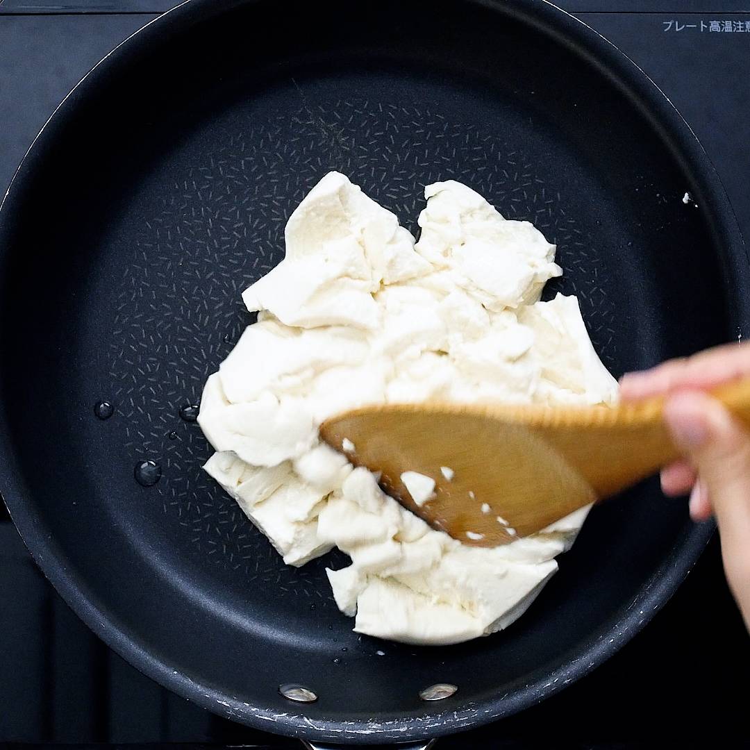 フライパンに②の豆腐を入れて、火を入れずにヘラでなめらかになるまでつぶします。