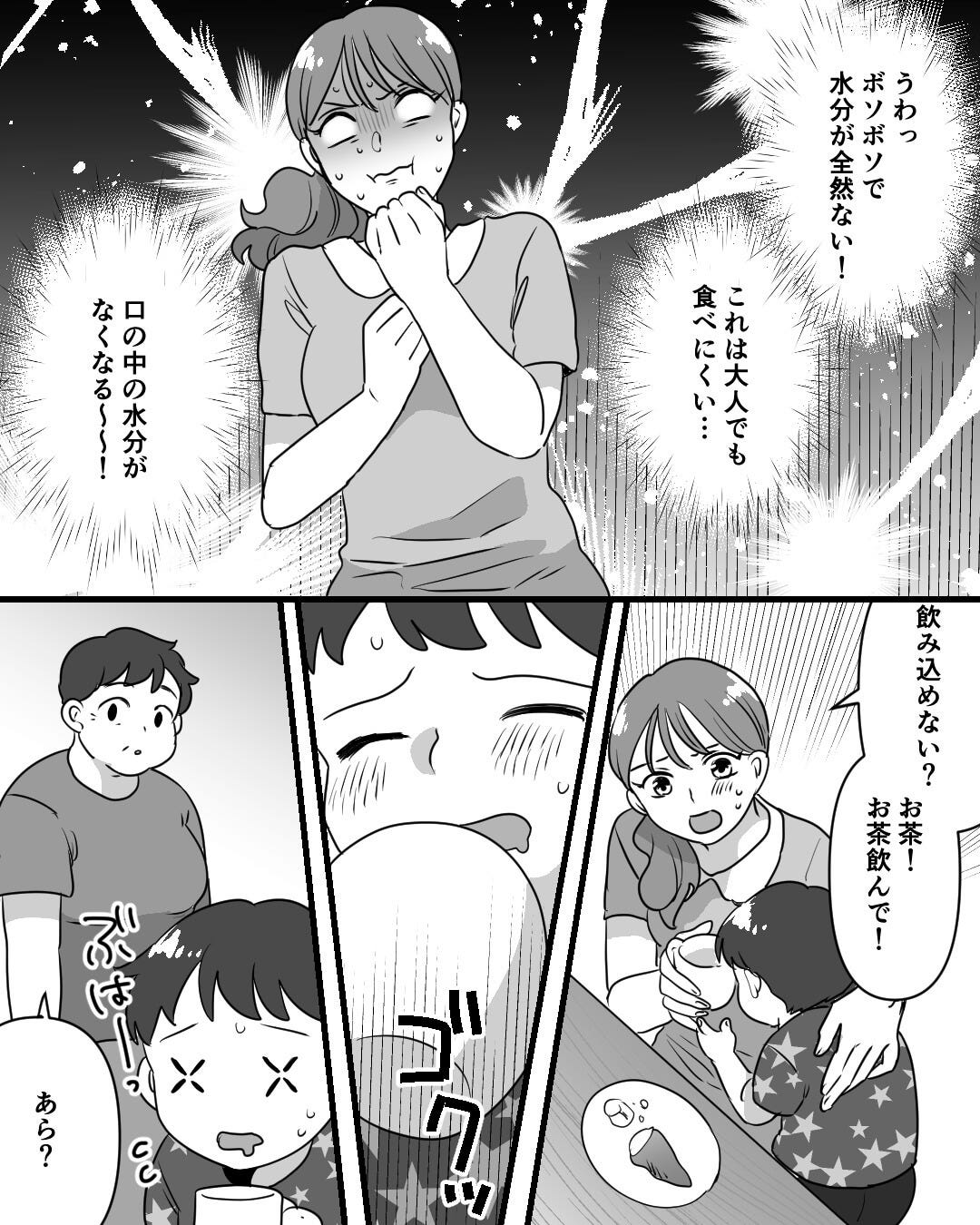 主人公は「飲み込めない!?お茶を飲んで!」と慌ててお茶を飲ませます。