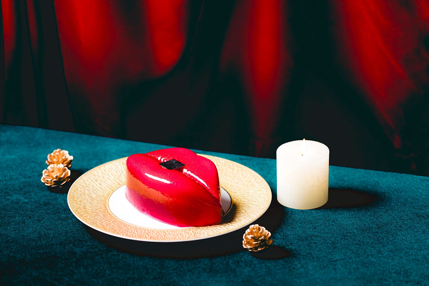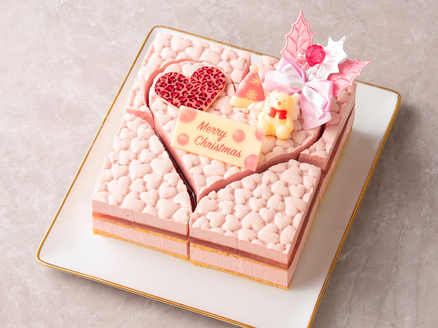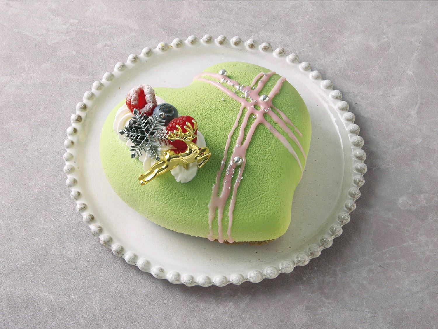 ラズベリー、ショコラ、ピスタチオを組み合わせた、ハート型のケーキ。クラシックなデコレーションで大人なクリスマスをイメージ。