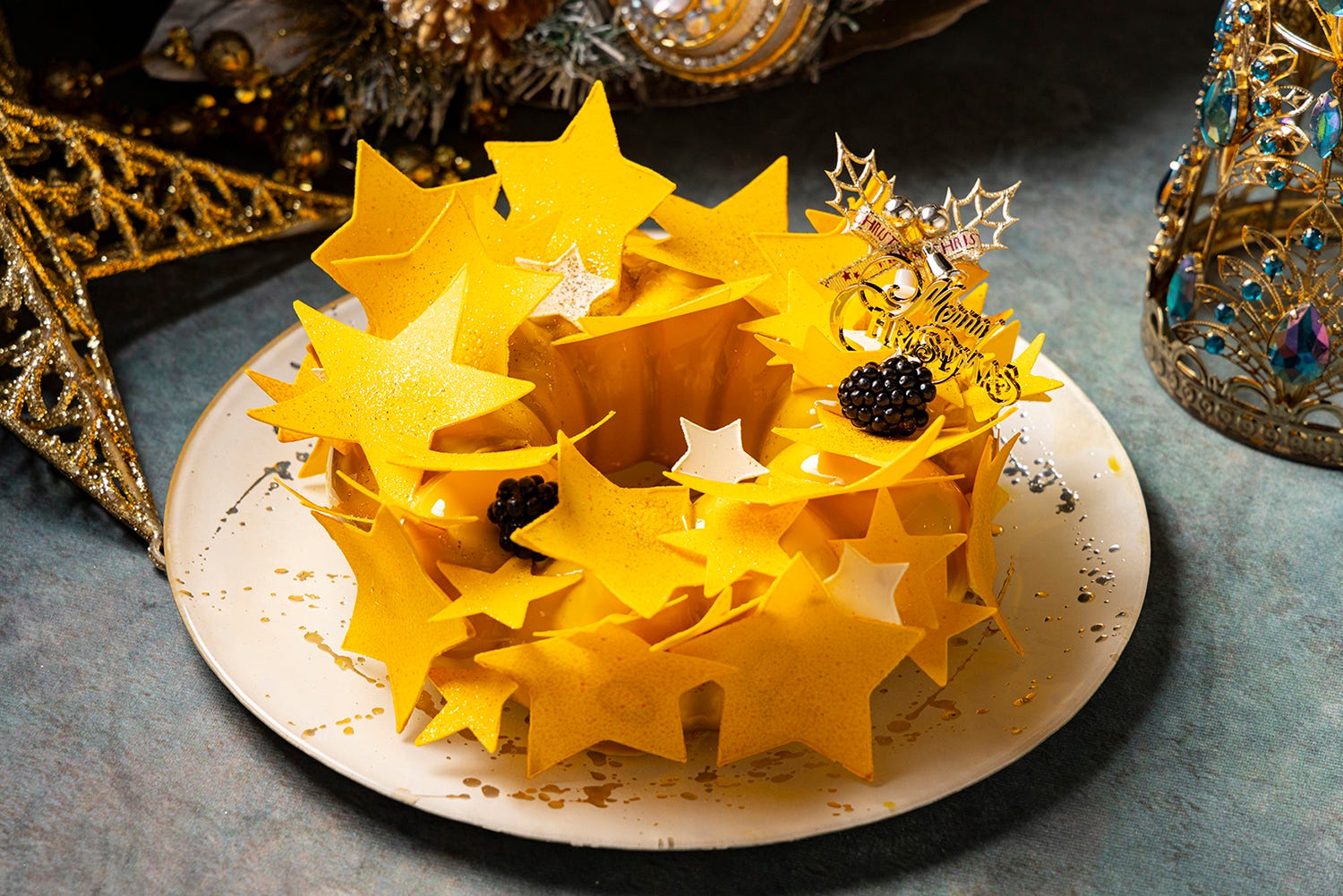 ブラックベリー風味の紅茶のムースの中にはカシスとブラックベリーのガナッシュとキャラメルソースを配しました。ヘーゼルナッツダックワーズとカリカリとした食感のプラリネフィアンティーヌがアクセントに。紅茶の上品な香りに甘酸っぱく深みのあるブラックベリーの味わいと濃厚なキャラメルソースの余韻が楽しめます。繊細な星型チョコレートをたっぷりと冠した華やかなクリスマスケーキは銀河をイメージ。