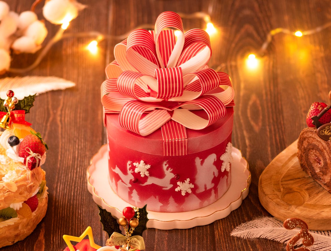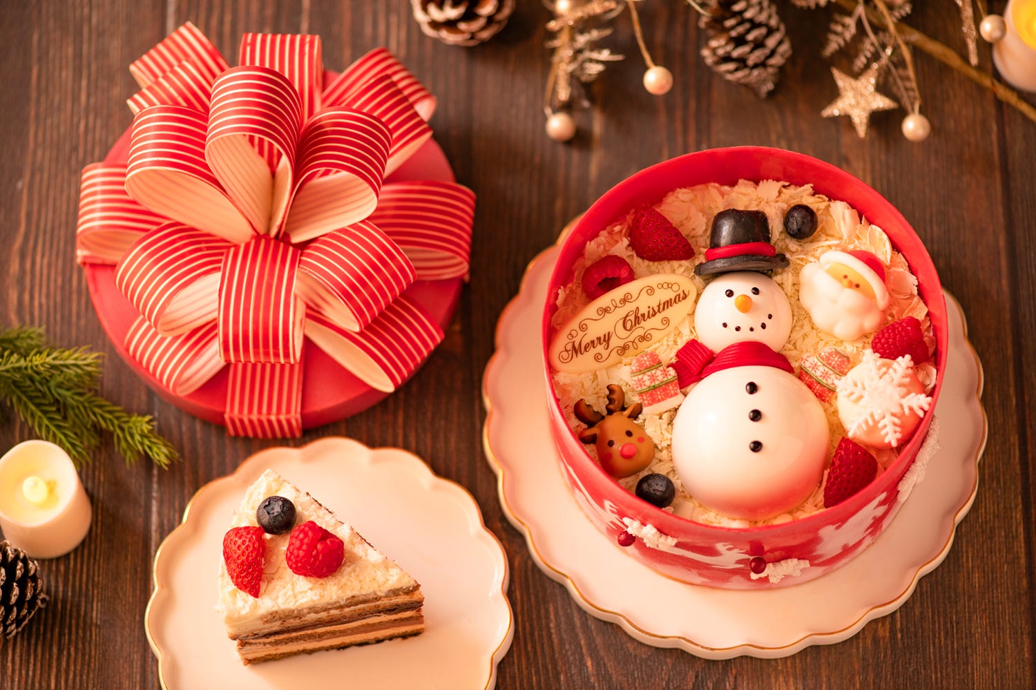 チョコレートでできた赤いプレゼントボックスを開けるとスノーマンやサンタクロースが現れる今年のシグネチャーケーキは、チョコレートオペラとティラミスの2種類を組み合わせた夢のようなケーキ。