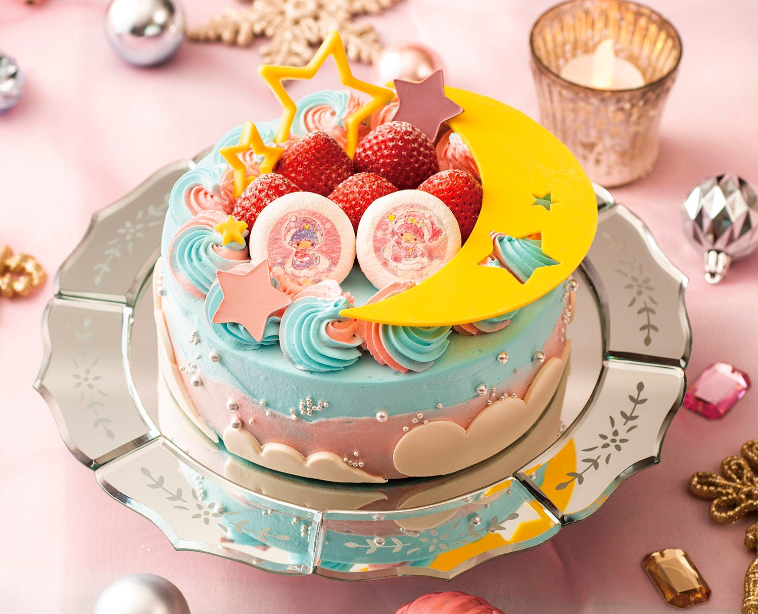 パティシエが細部までこだわり、作り上げたキキ&ララのクリスマスケーキには、チョコレートでかたどった大きな三日月や星を飾り、キャラクターのイメージしたカラーとしてピンクとブルーの2色のクリームを絞り、センターにはキキ&ララが描かれたマシュマロをON。