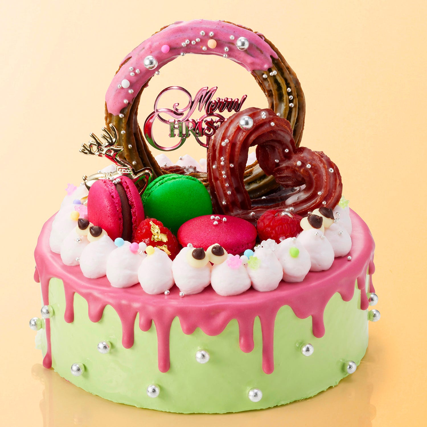 聖夜にパレードするトロッコやリースをイメージした、チュロスが主役のケーキ。チェリー風味のチョコレートムースの中には、甘酸っぱいグリオットジュレと濃厚なピスタチオのババロア入り。