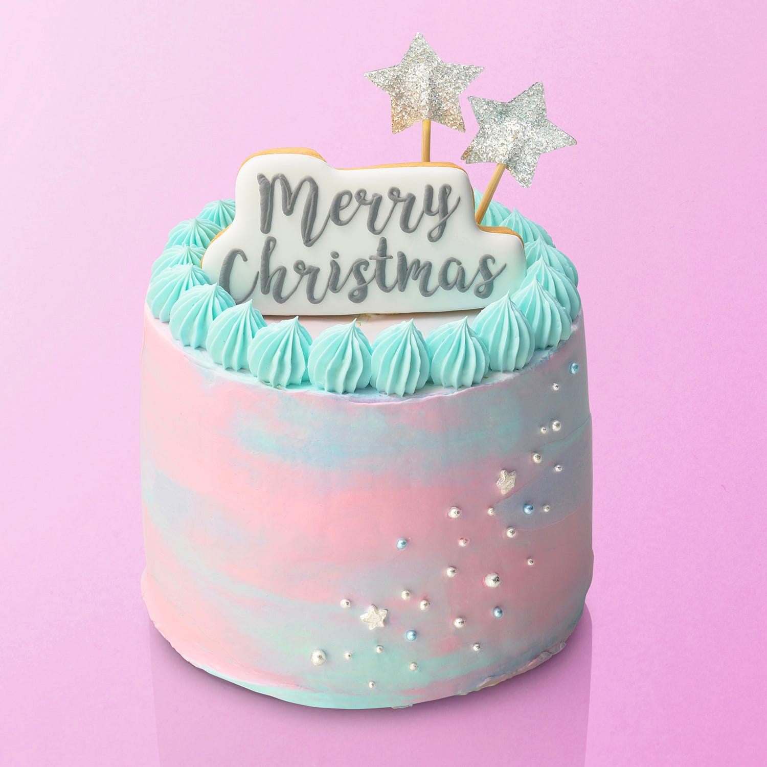 いちごと生クリームがサンドされた生地の側面を覆うマーブル模様のバタークリームで夢の中を表現したケーキ。アラザンを散りばめ、人々の願いを乗せた一筋の星の河が流れています。星のピックと可愛らしいアイシングクッキーで仕上げている。