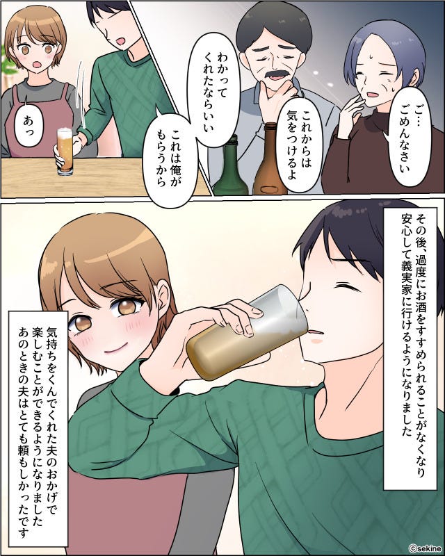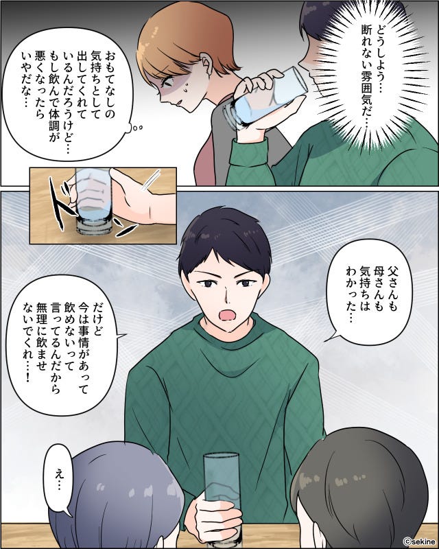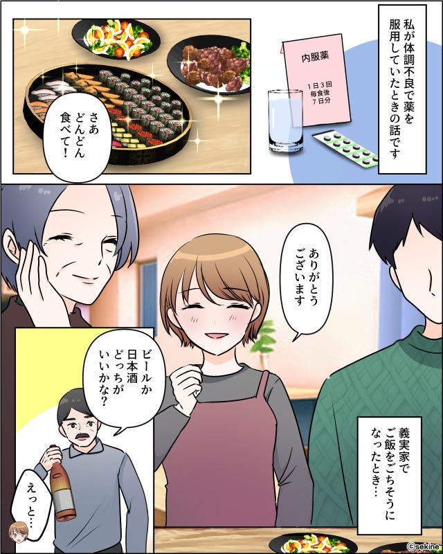 薬を服用していた主人公に、お酒をすすめてきた義両親。