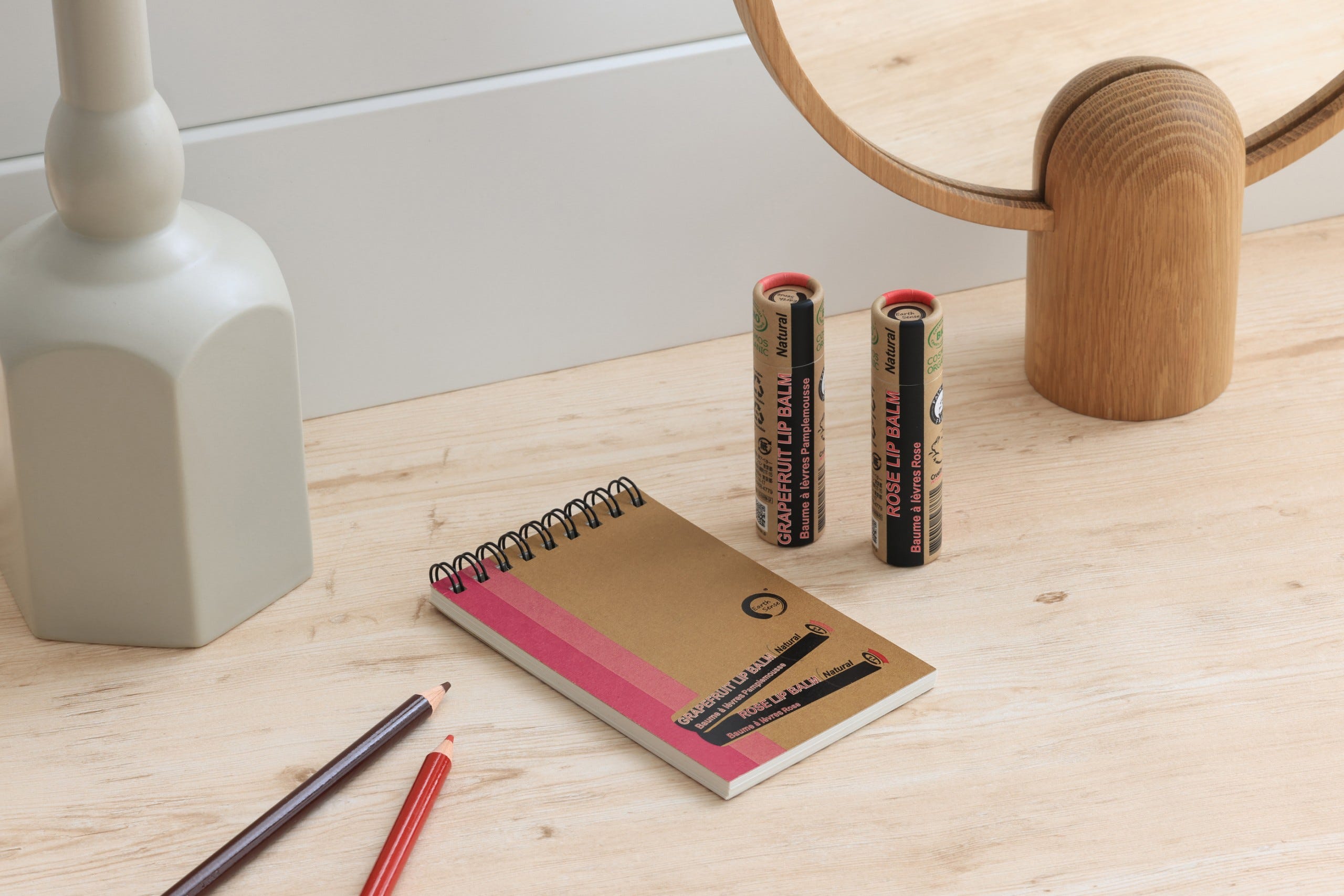 通常は廃棄していたナタデココの端材をアップサイクルしたオリジナルノートは、リップ&ボディバームの新フレーバーをデザインに生かしています。さまざまなシーンで使いやすい小ぶりなB7サイズです。