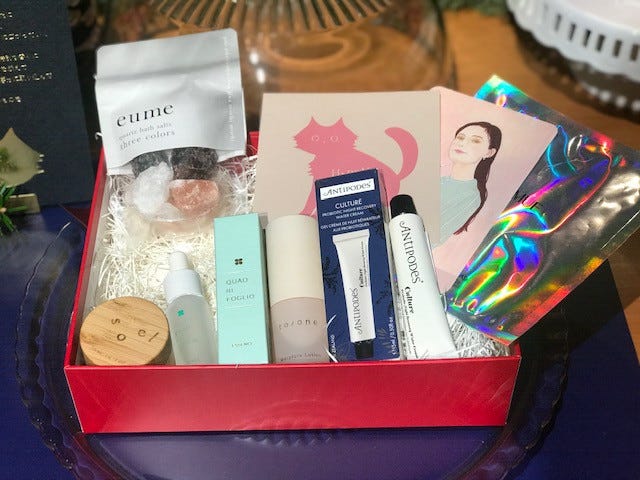 【eume】クォーツバスソルト、【FEMMUE】ドリームグロウマスク、【QUADRI FOGLIO】RPショット、【to/one】モイスチャー ローション 、【Antipodes】カルチャープロバイオティクス ナイト ウォータークリーム、【soel】リビングオイルソープ ホリデーキットブレンドと人気ブランドのヒット商品が詰め込まれた夢のボックス♡