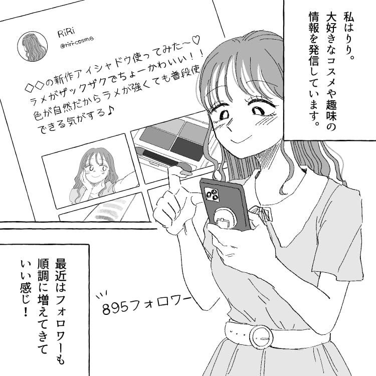 主人公はSNSで趣味について投稿をしています。最近はフォロワーも増えてきて順調な様子。