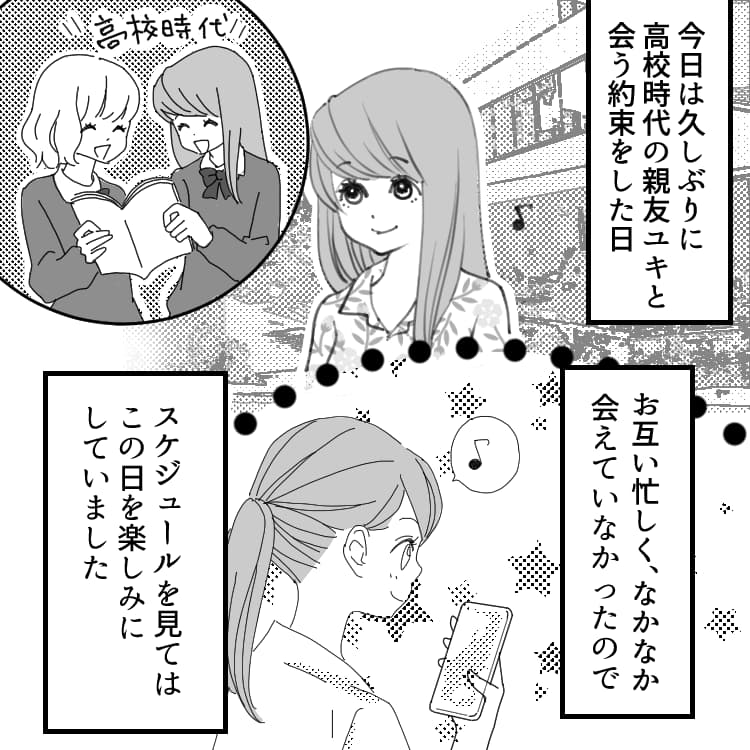 主人公は高校時代の友だち・ユキと久しぶりに会うことに。お互い忙しく、しばらくの間会えていなかったので、彼女はこの日を楽しみにしていました。