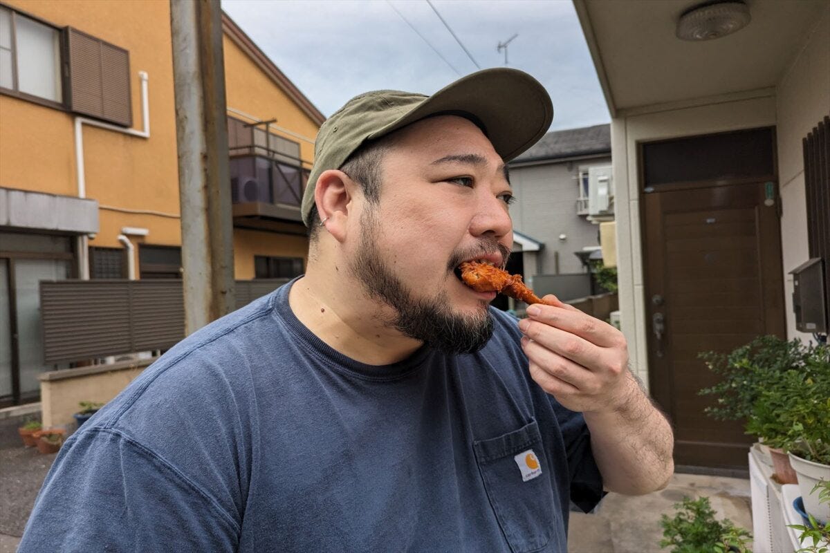コロッケとメンチに続き、手羽もいただく奏さん。さまざまな肉店を巡ってきたが、その中でも肉のまきたはイチオシできる店であった。