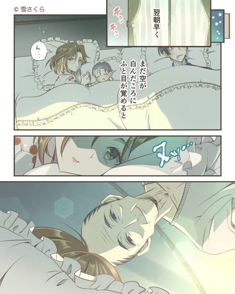 主人公と夫の間で眠る息子をニコニコと眺めていたのですが、驚いた主人公は思わず「ひぃっ!」と声を上げてしまいました。