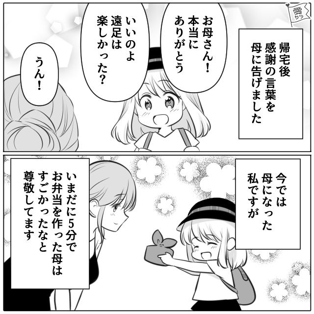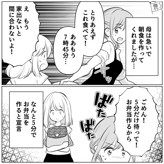 わずか5分で、主人公が好きなおかずでお弁当を作った母。