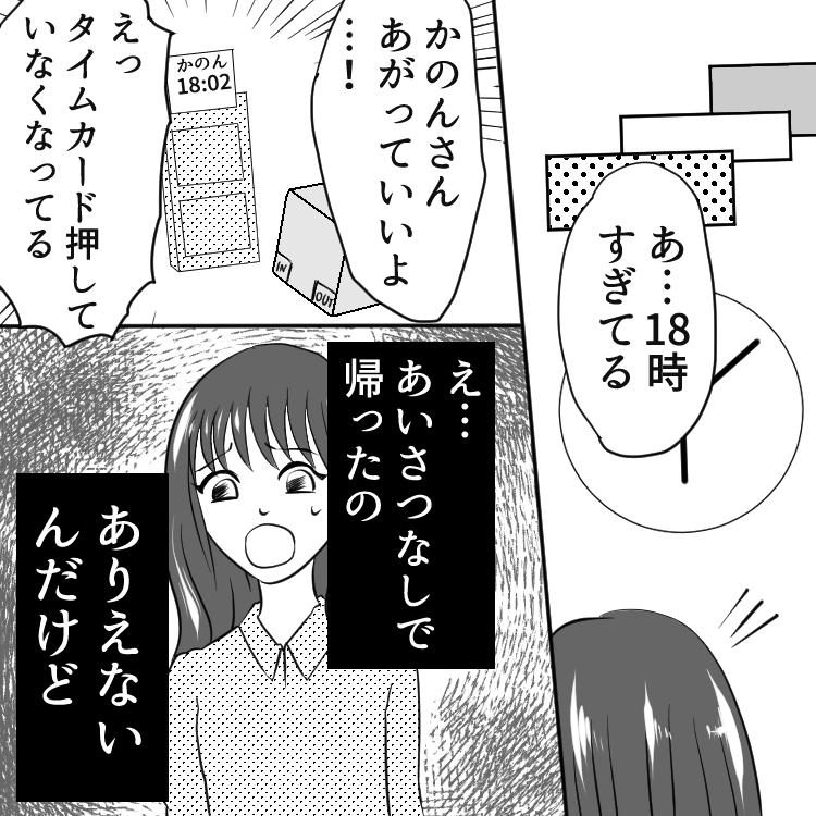 仕事の覚えが悪い新人を強く叱った主人公。その後、新人は主人公にあいさつもせず、逃げるように定時に退勤します。