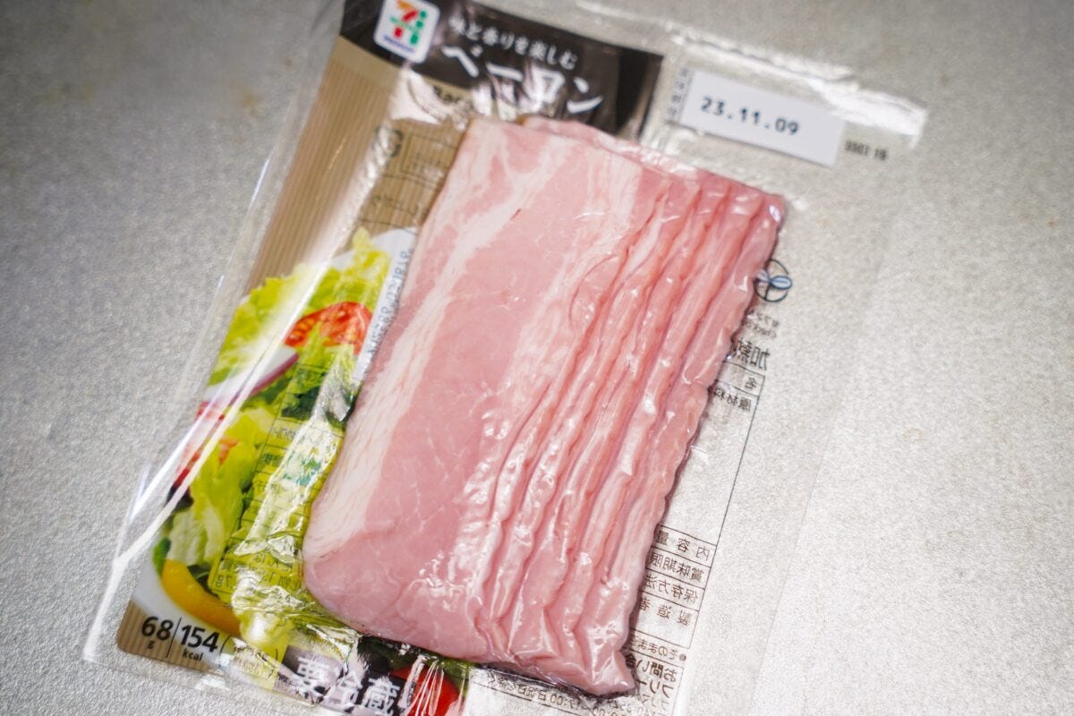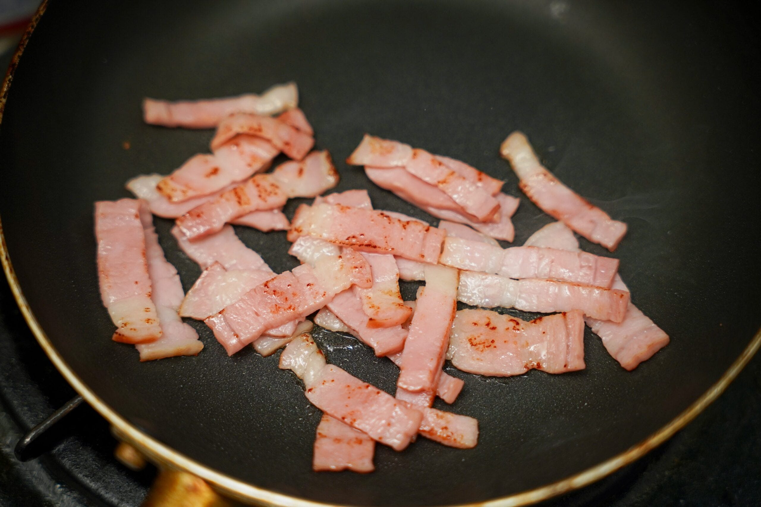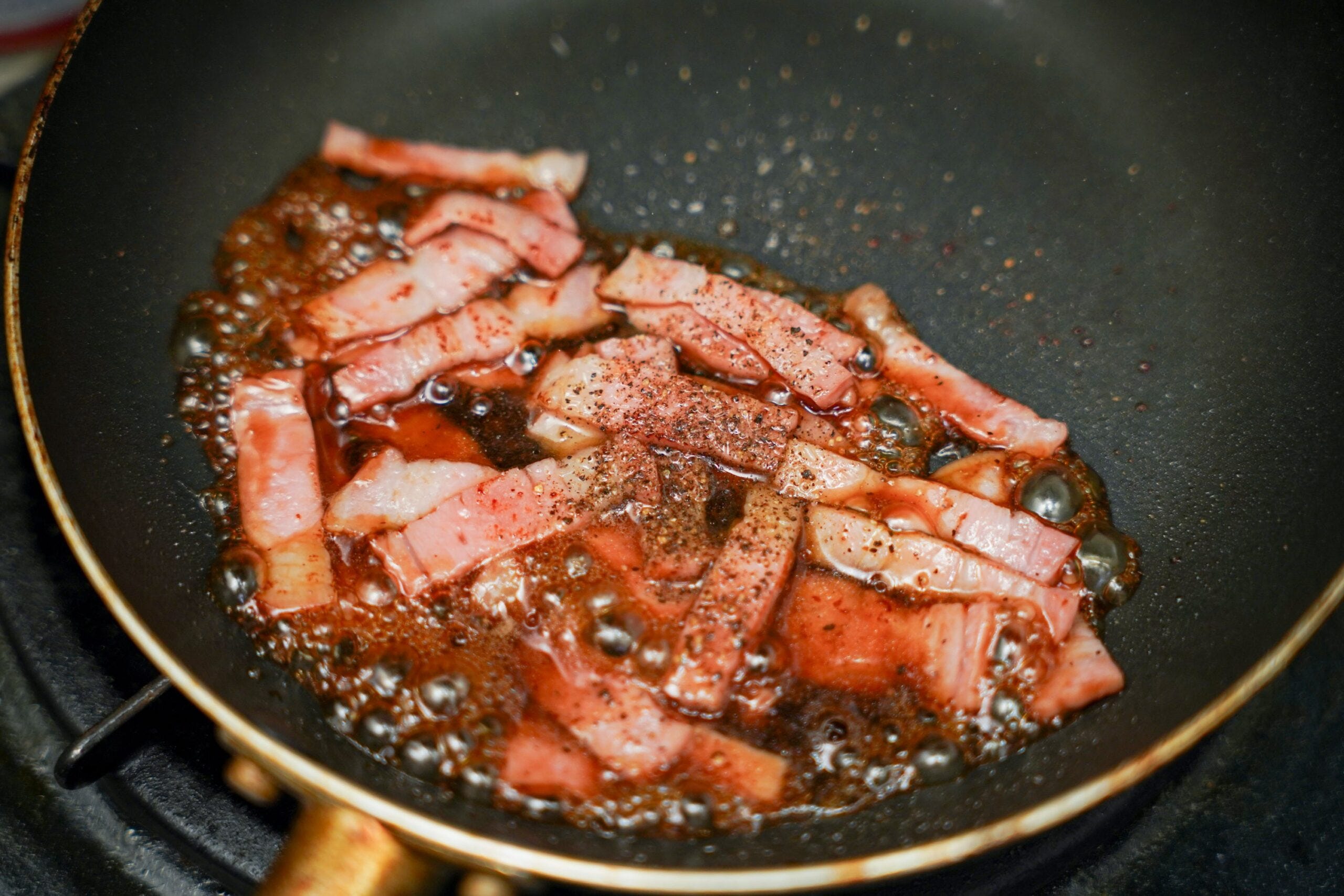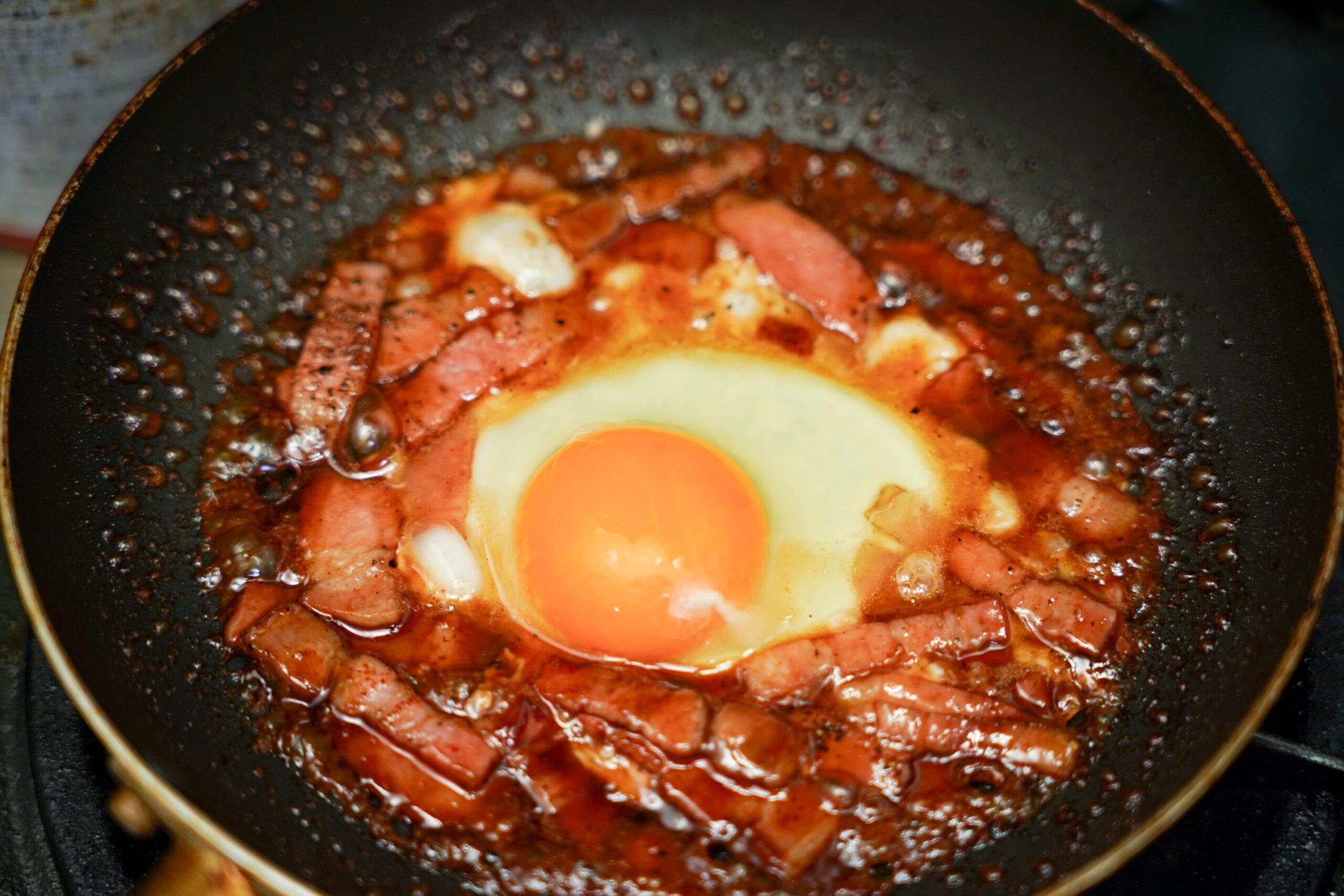 調理はかなり簡単。ベーコンを細切りにカットし、フライパンで炒めていく。いい感じに火が入ったら醤油、みりん、酒、味の素、黒胡椒を入れて煮詰めていこう。水分が飛んできたらバターを入れ、溶けたら中心に生卵を落とし入れる。