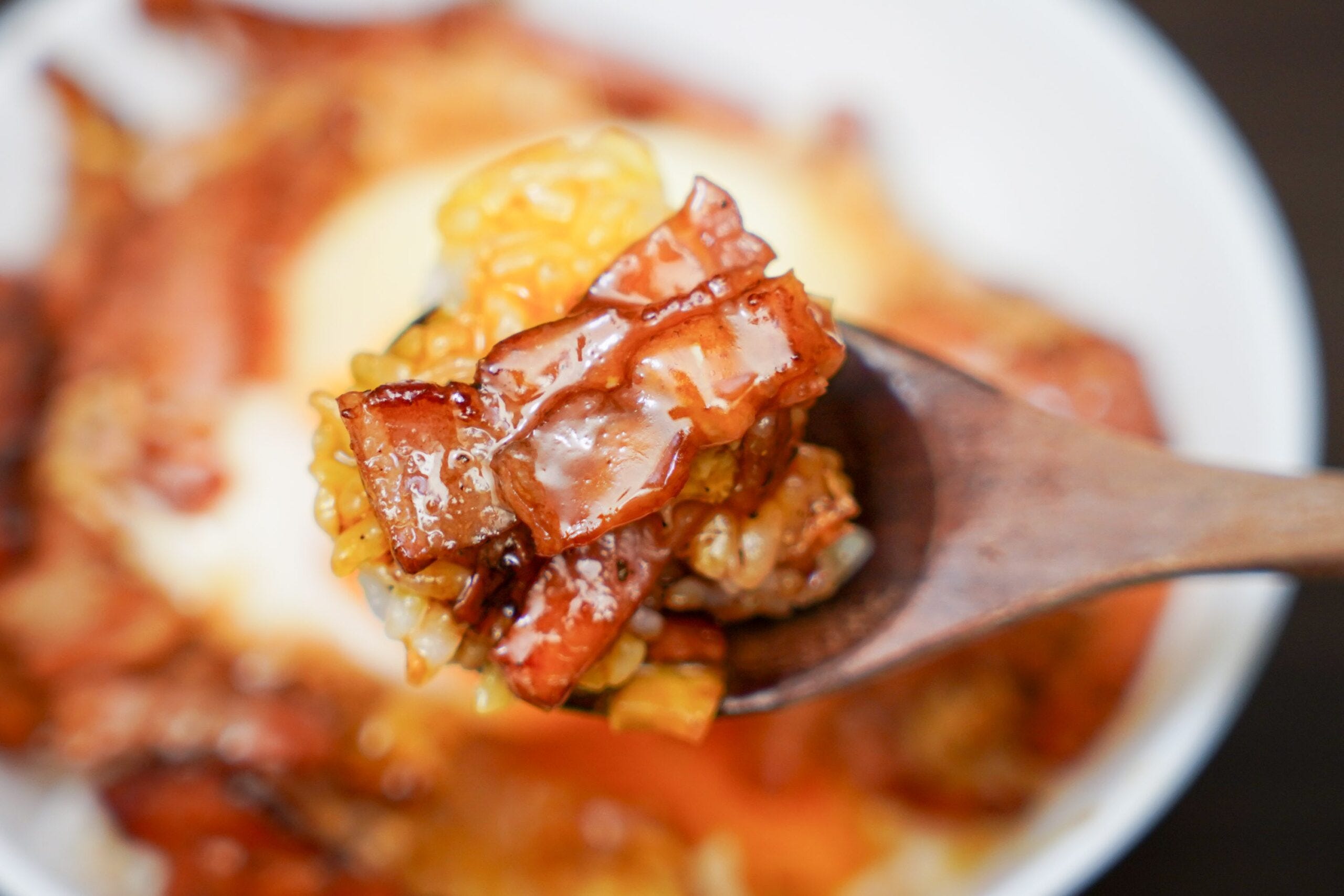 見た目はかなりいい感じ。一口食べると、少ない材料・調味料であるのにガツンとした旨味があリ驚かされた。ベーコンの塩気と黄身の濃厚な味は相性が良く、煮詰めたことでコク深くなっている調味料が加わることで米が進みまくる味わいに。ジャンク感があり好みは分かれるかもしれないが、好きな人はかなりハマるのではないだろうか。