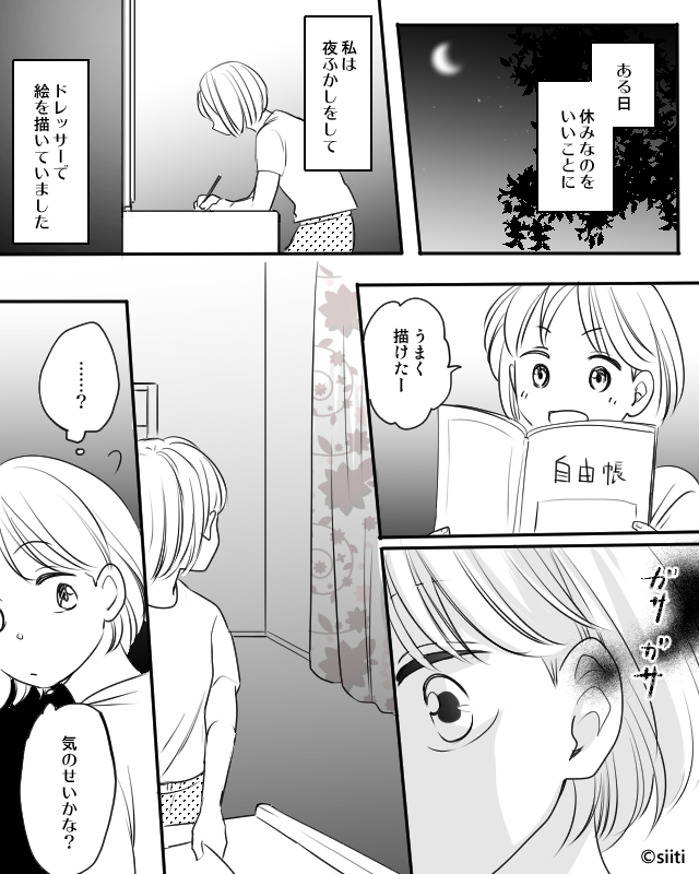 夜ふかしをしていたら、背後の人影を見てしまった主人公。