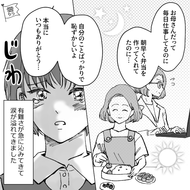 誕生日を祝うメッセージ付きのお弁当で、母の思いを感じ取った主人公。