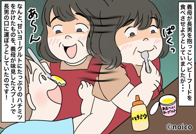そして義母が口をつけたスプーンで、そのまま息子に食べさせようとしていました。