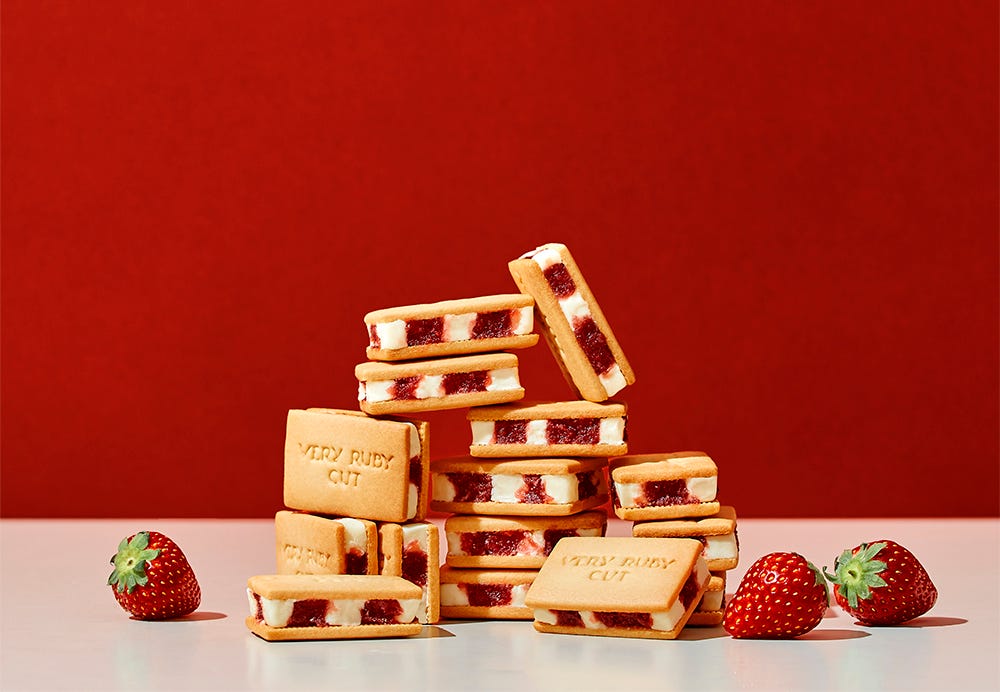 真っ赤な果肉と香り高い甘さが特徴の“イタリア産サブリナ苺”を、とろっと煮詰めた苺コンフィチュール。練乳ミルクのコクをなめらかに練り上げたホワイトショコラ。ふたつが柔らかなまま組み合わさった“とろけるダブルメルト製法”が美味しさの決め手。お口の中で苺とミルクが同時にとろっと溢れる至福の美味しさを、しっとりしたクッキーでサンド。