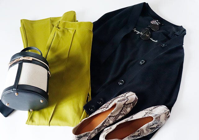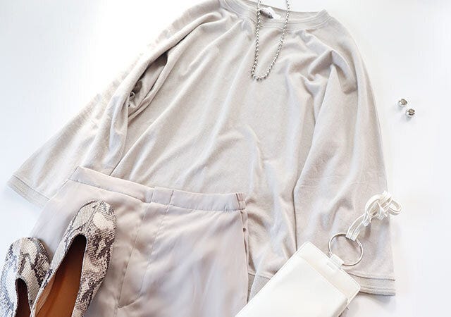 カジュアルなトップスなので、反対にパンツは艶感のあるドレッシーなものを。小振りなバックと、パイソン柄のパンプスやアクセサリーで華やかなカジュアルスタイルにしてみました。