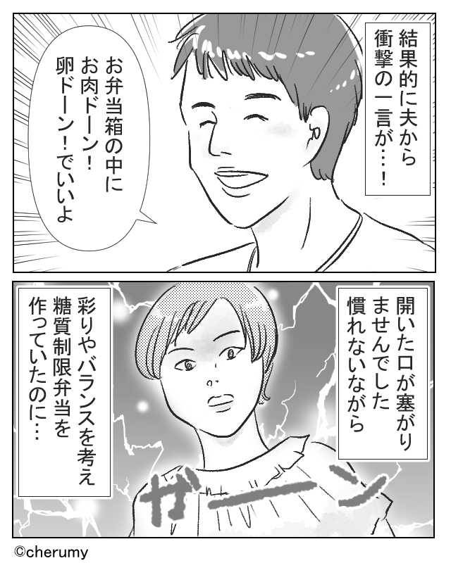 彩りやバランスを考えて糖質制限弁当を作っていた主人公は、開いた口が塞がりません。