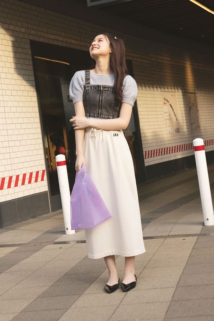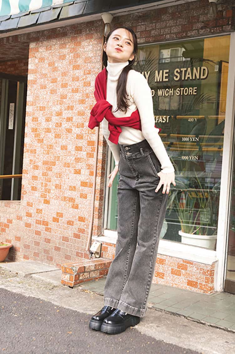 デニムパンツは着回し。白タートルニット 1,870円/レトロガール、丈短ロゴスエット 2,530円/エムズエキサイト(ともにR1000) ローファー 8,500円/オリエンタルトラフィック(ダブルエー) 撮影/島田彩枝加(Luuna Management・モデル)、上田祐輝(静物) スタイリング/城田望(KIND) へア&メイク/サイオチアキ(Lila) モデル/金川紗耶(本誌専属) 文/天井玖瑠海